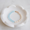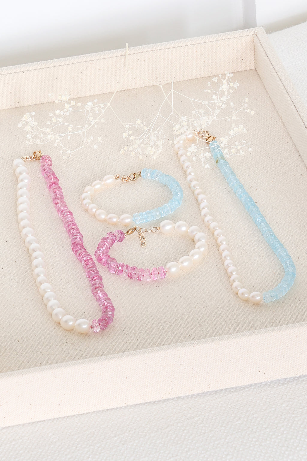 Radiant and refined, this necklace pairs the vivid brilliance of blue topaz known as a stone of clarity and calm with the soft luster of freshwater cultured pearls. The contrast between the gemstone's sparkling sky-blue tones and the pearls' gentle glow creates a design that feels both luminous and timeless.