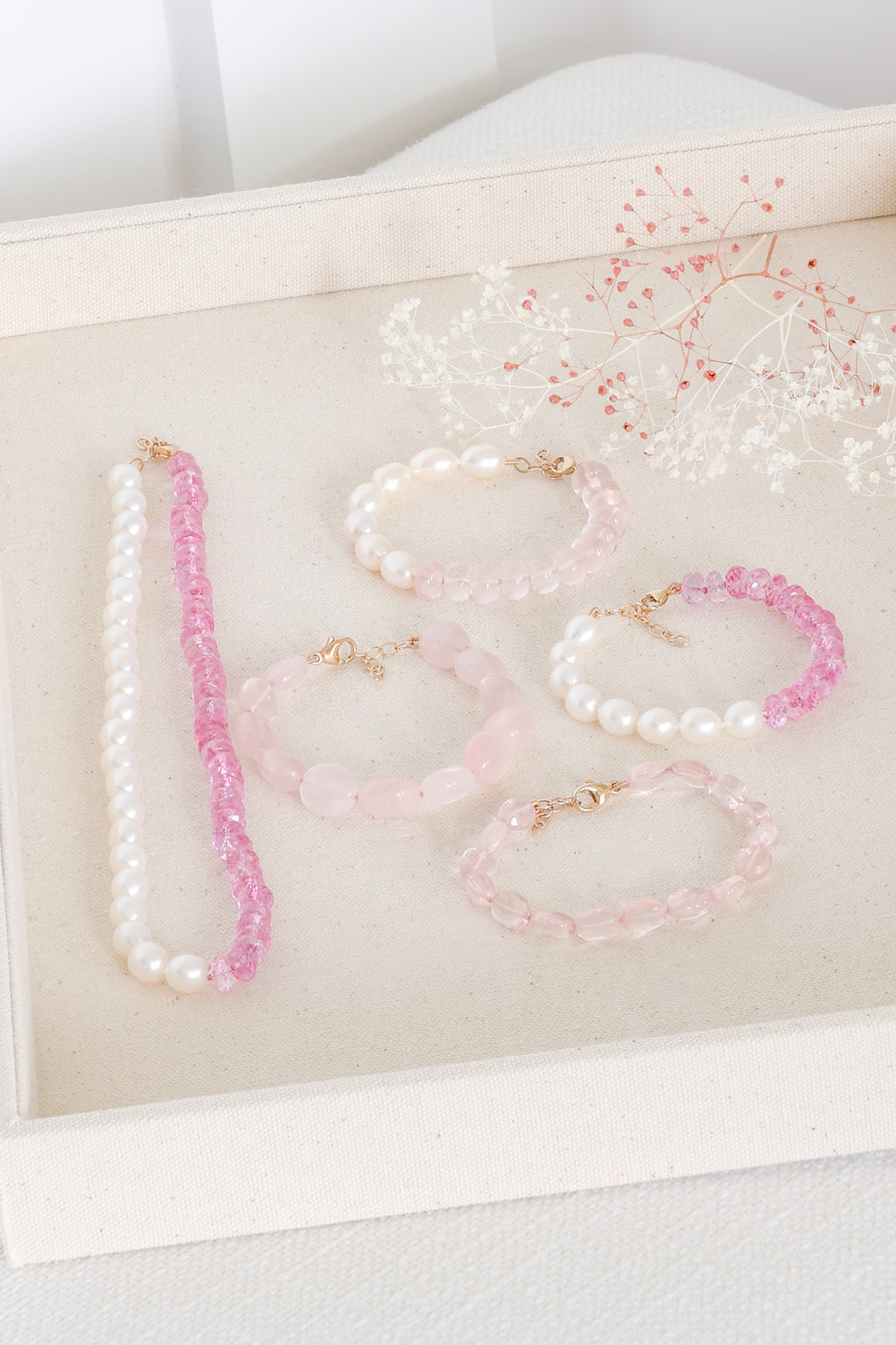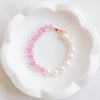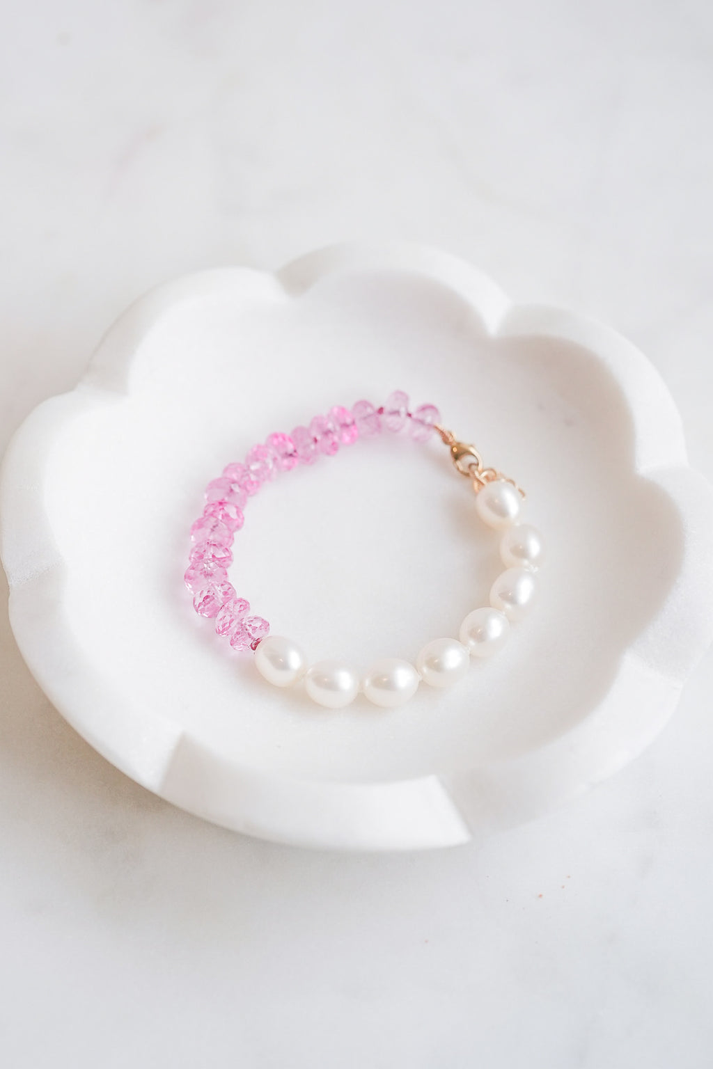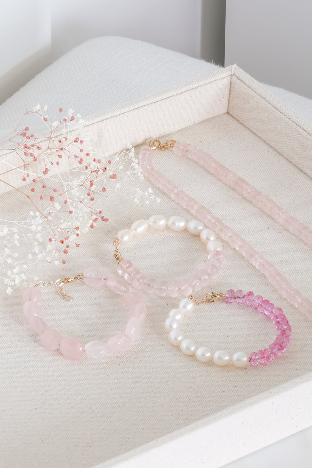 Radiant and refined, this bracelet pairs the vibrant tones of pink topaz, often associated with love and joy, with the gentle luster of freshwater cultured pearls. The contrast between the gemstones' vibrancy and the pearls' luminous glow creates a harmonious blend of warmth and elegance.