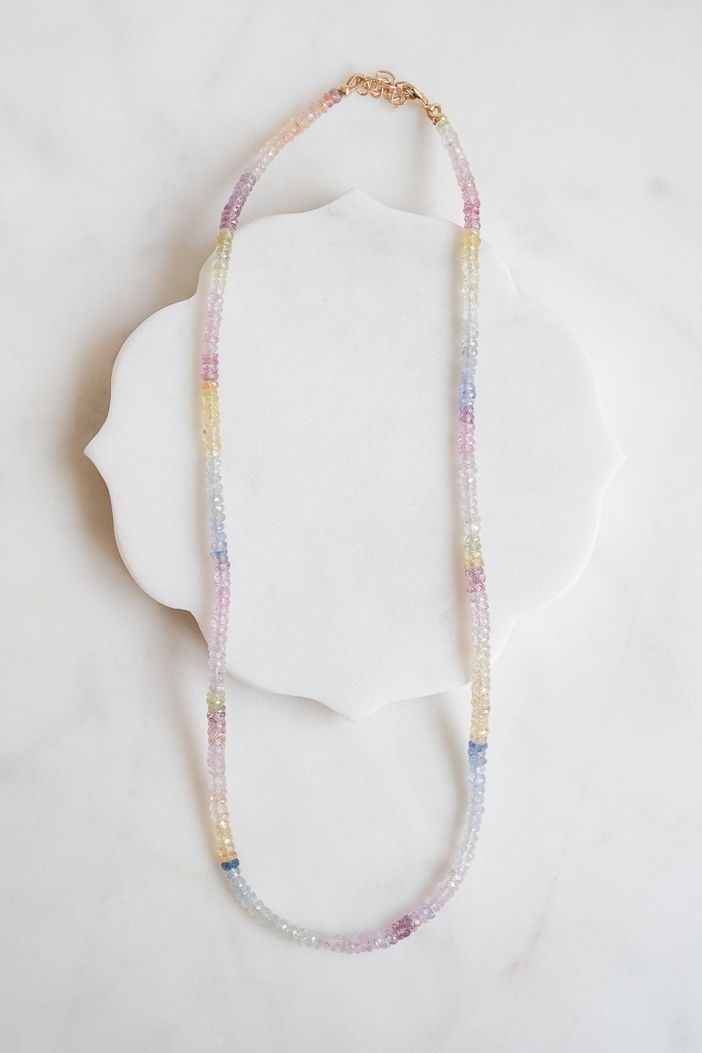 A vibrant yet refined take on color, this necklace features natural sapphires in a range of soft hues, from pale peach to warm gold, dusty rose, and muted blue. Each stone is hand-selected and arranged to highlight the natural variation in tone, creating a palette that’s subtle, harmonious, and completely unique. Finished with a 14k yellow gold clasp, this piece brings a touch of color to everyday wear with quiet sophistication.