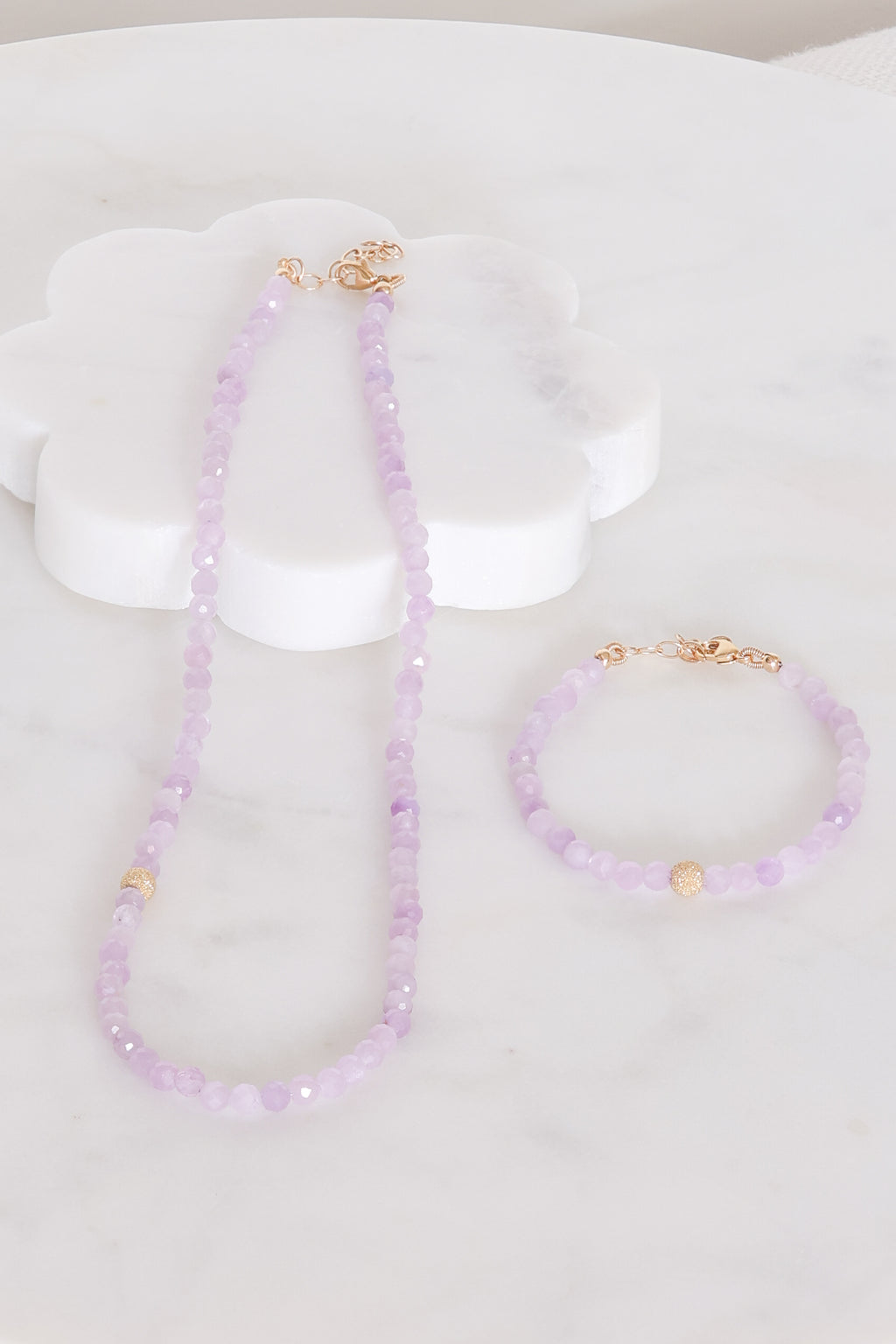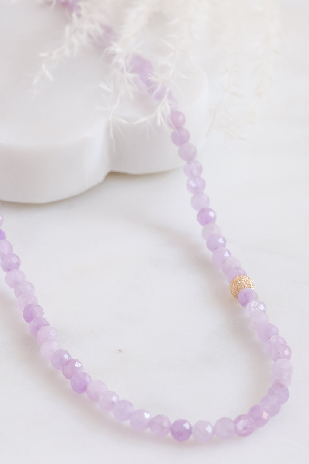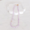 Softly luminous and quietly elegant, this necklace features natural kunzite in shades of pale lilac. Each stone holds a gentle inner glow. Known as the “stone of emotion,” kunzite is associated with openness of heart and calm, graceful strength. A 14k stardust yellow gold bead offers a warm, grounding accent. A quietly radiant piece that feels both refined and effortless, perfect alone, or layered.