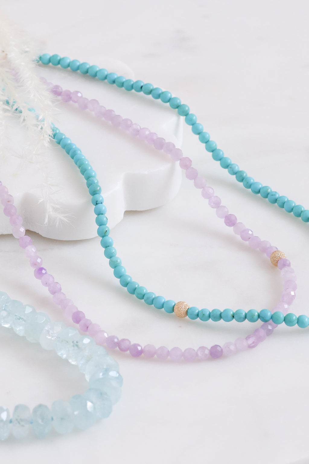 I loved creating this necklace for the balance it strikes between softness and structure. The pale hues of kunzite feel serene and feminine, while the gold bead adds a quiet point of focus. It’s a piece that feels composed, delicate, and effortlessly luminous.