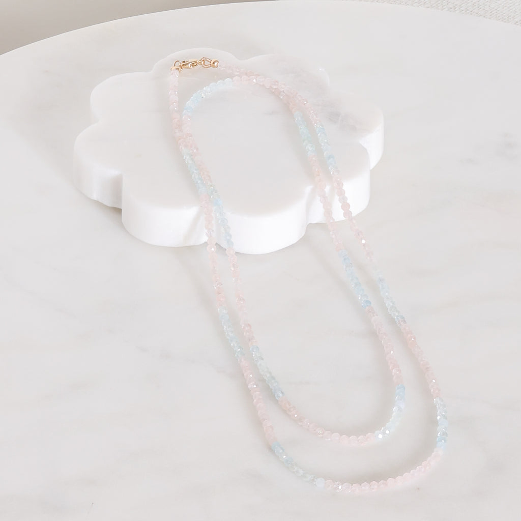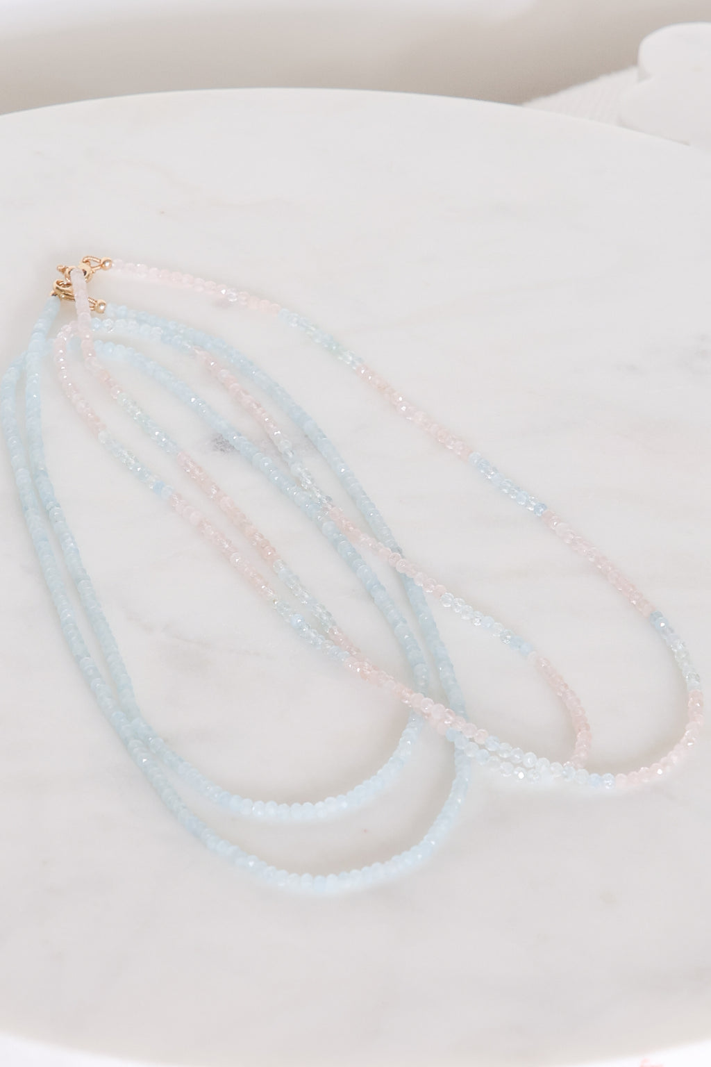 Elegant and versatile, this long necklace features a delicate harmony of aquamarine and morganite. Aquamarine, long associated with serenity and clarity, carries the soothing energy of the sea, while morganite, known as a stone of love and compassion, radiates warmth and tenderness. Together, their soft blue and blush tones create a luminous balance of calm and affection. Designed to be worn as a single strand or doubled for a layered look, it moves effortlessly from day to evening with timeless grace.