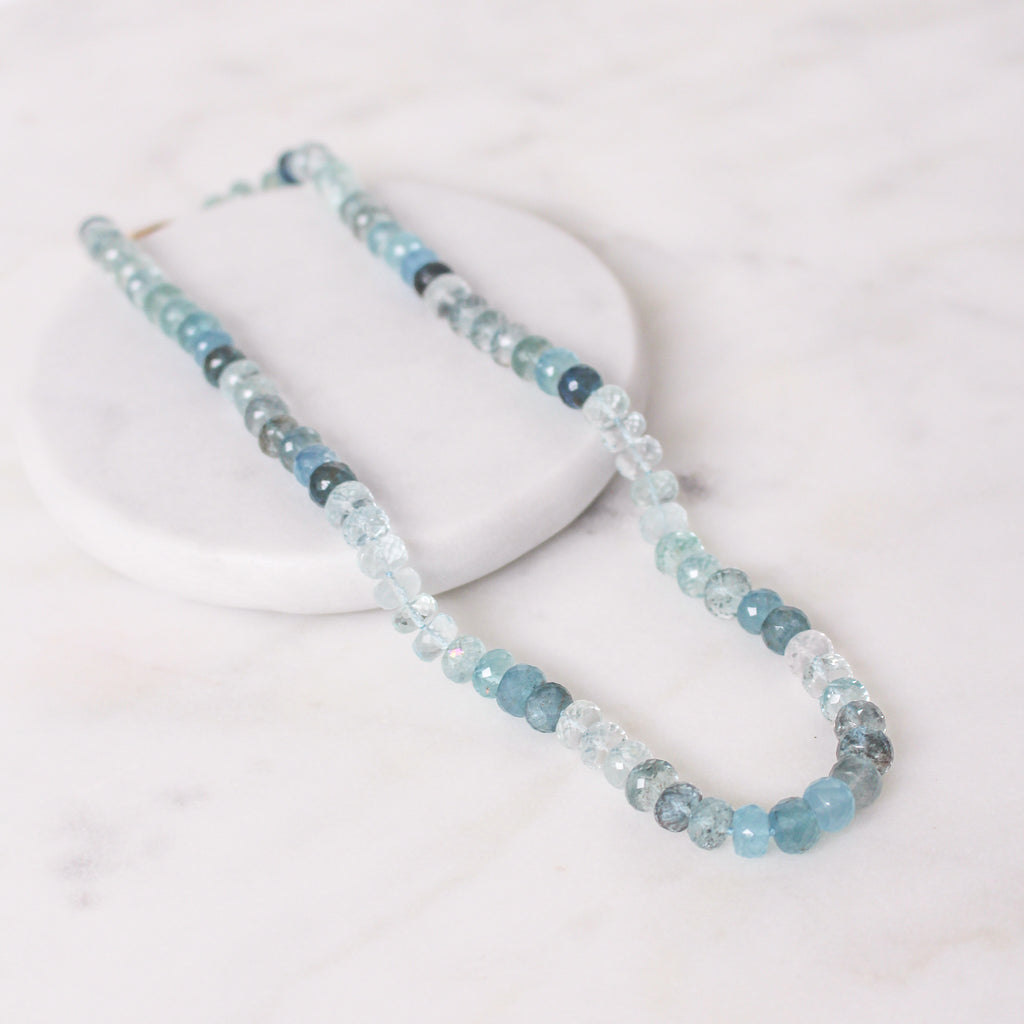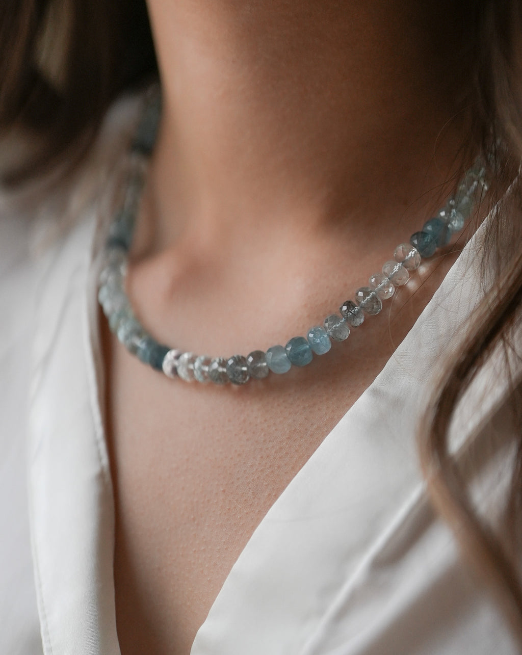 Earthy, luminous, and quietly powerful, this necklace is hand-knotted with natural moss aquamarine gemstones. The gentle variations of blue and misty gray echo the peaceful rhythm of water and stone. Moss aquamarine is celebrated for its calming and grounding energy, thought to encourage emotional clarity and a deep sense of serenity.