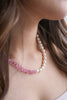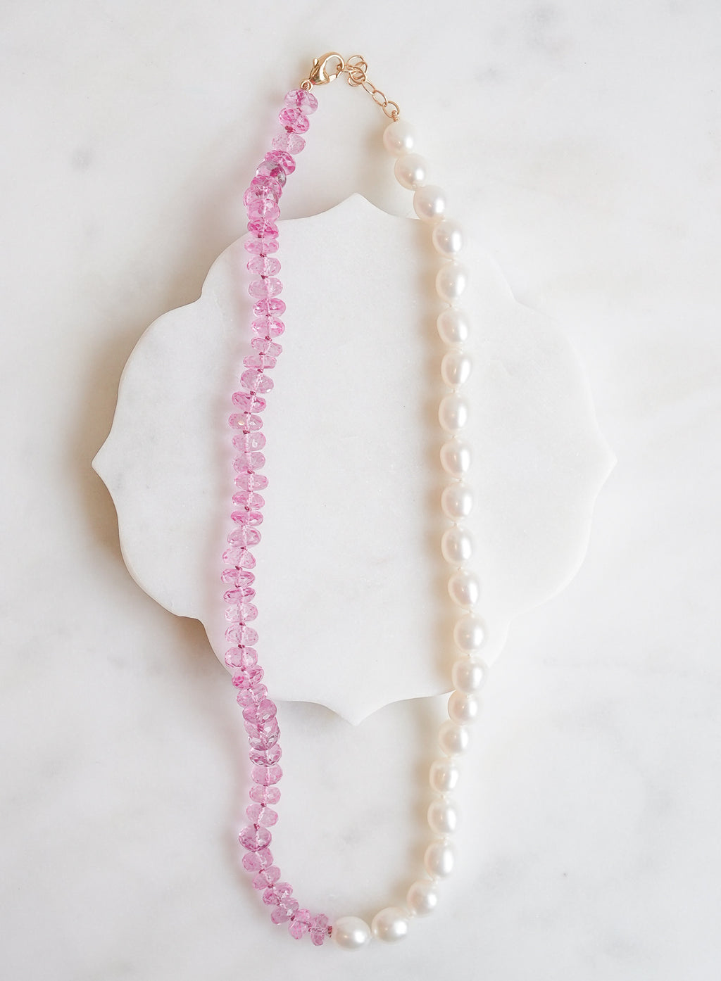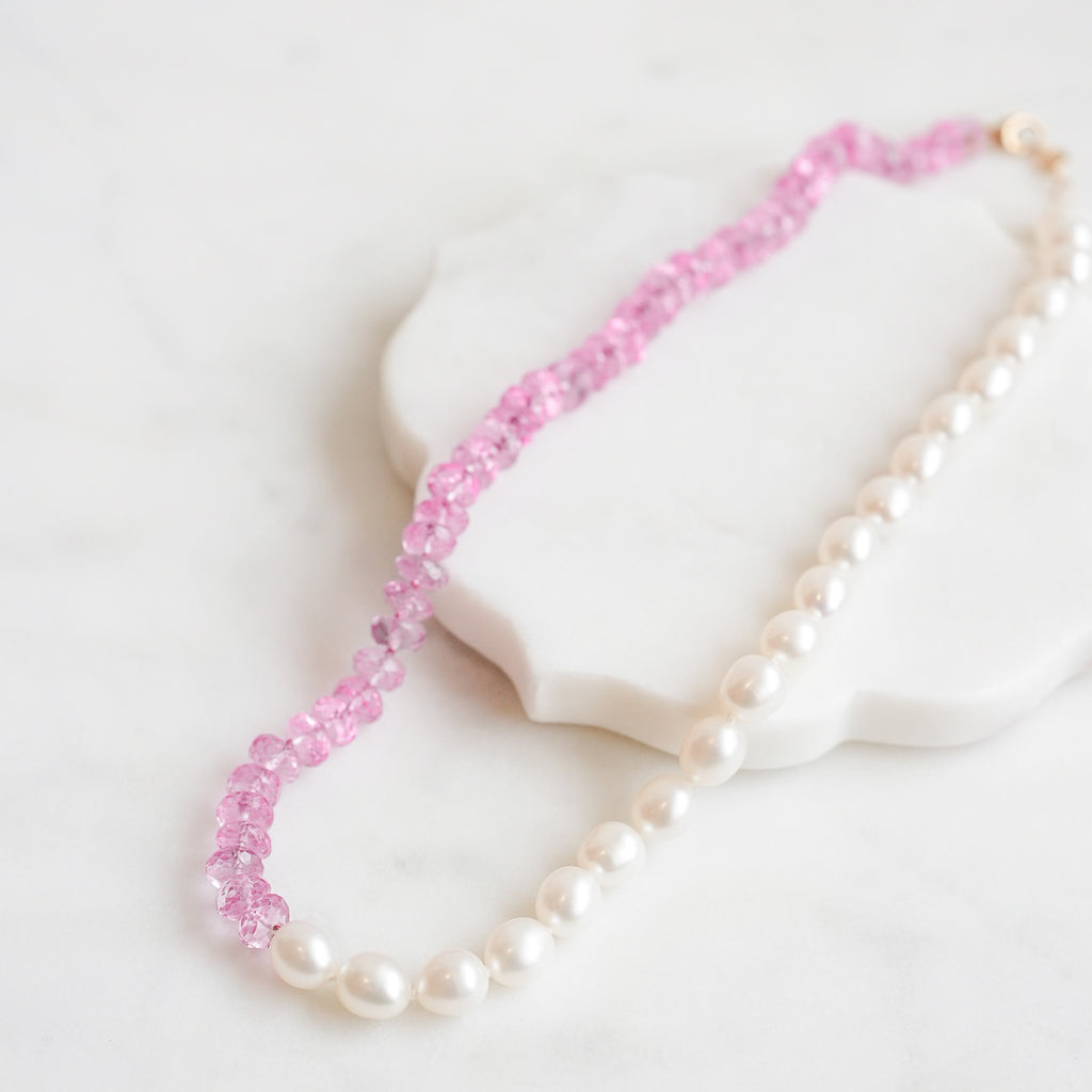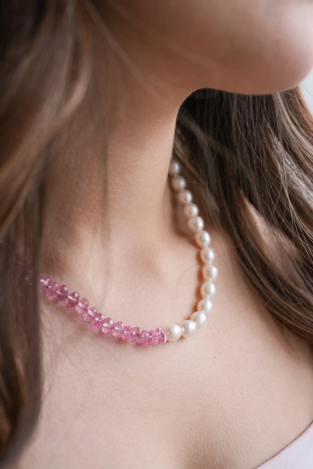 Radiant and refined, this necklace pairs the vibrant tones of pink topaz, often associated with love and joy, with the gentle luster of freshwater cultured pearls. The contrast between the gemstones' vibrancy and the pearls' luminous glow creates a harmonious blend of warmth and elegance.