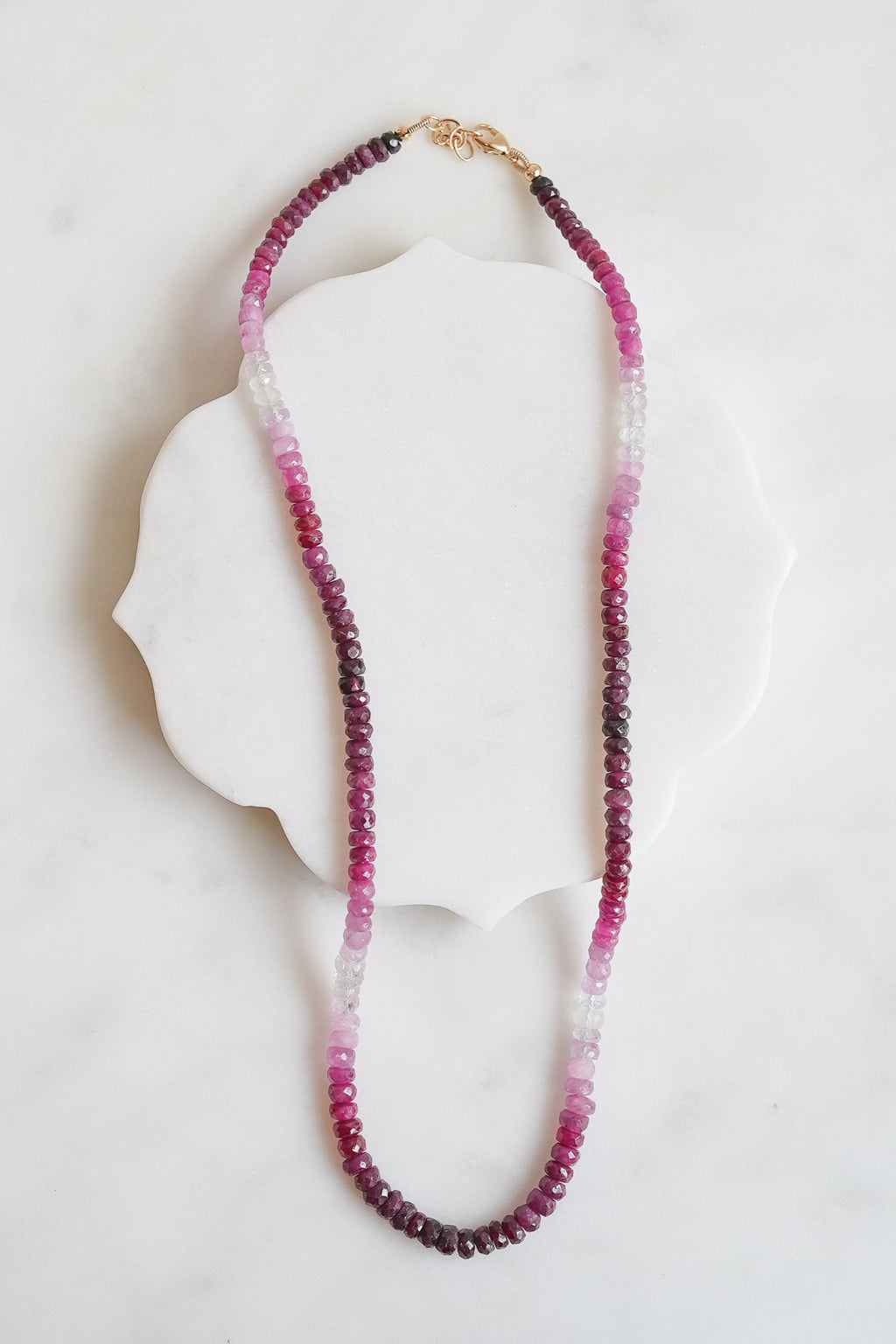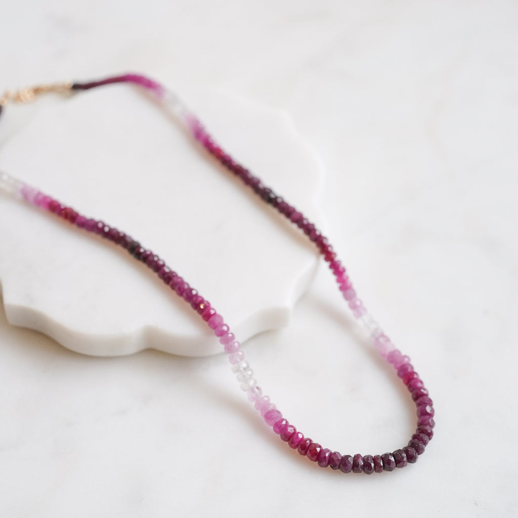 This stunning necklace features captivating, shaded rubies paired with radiant 14k gold accents. The rubies display a beautiful gradient, ranging from clear to dark red, highlighting the natural beauty and uniqueness of each stone. Whether worn as a statement piece or to add a touch of sophistication to your everyday look, this necklace embodies timeless elegance and exceptional craftsmanship.
