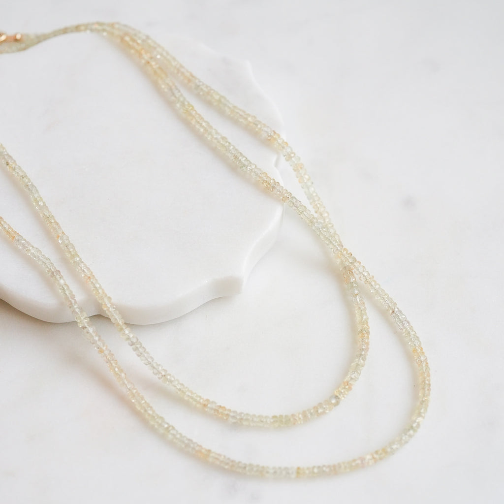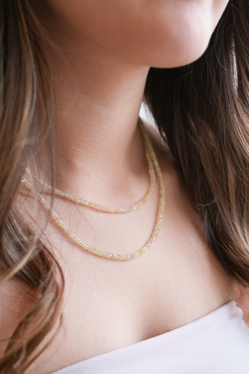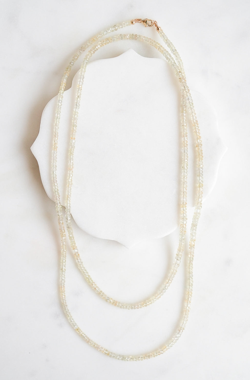 Delicate yet luminous, this necklace features faceted light yellow sapphires, chosen for their subtle sparkle and soft, golden hue. Hand-strung and finished with a 14k yellow gold clasp, the 34-inch length offers styling flexibility: wear it as a long, elegant strand or doubled for a layered, more structured look. Refined and quietly radiant, it’s a piece that elevates the everyday with understated luxury.